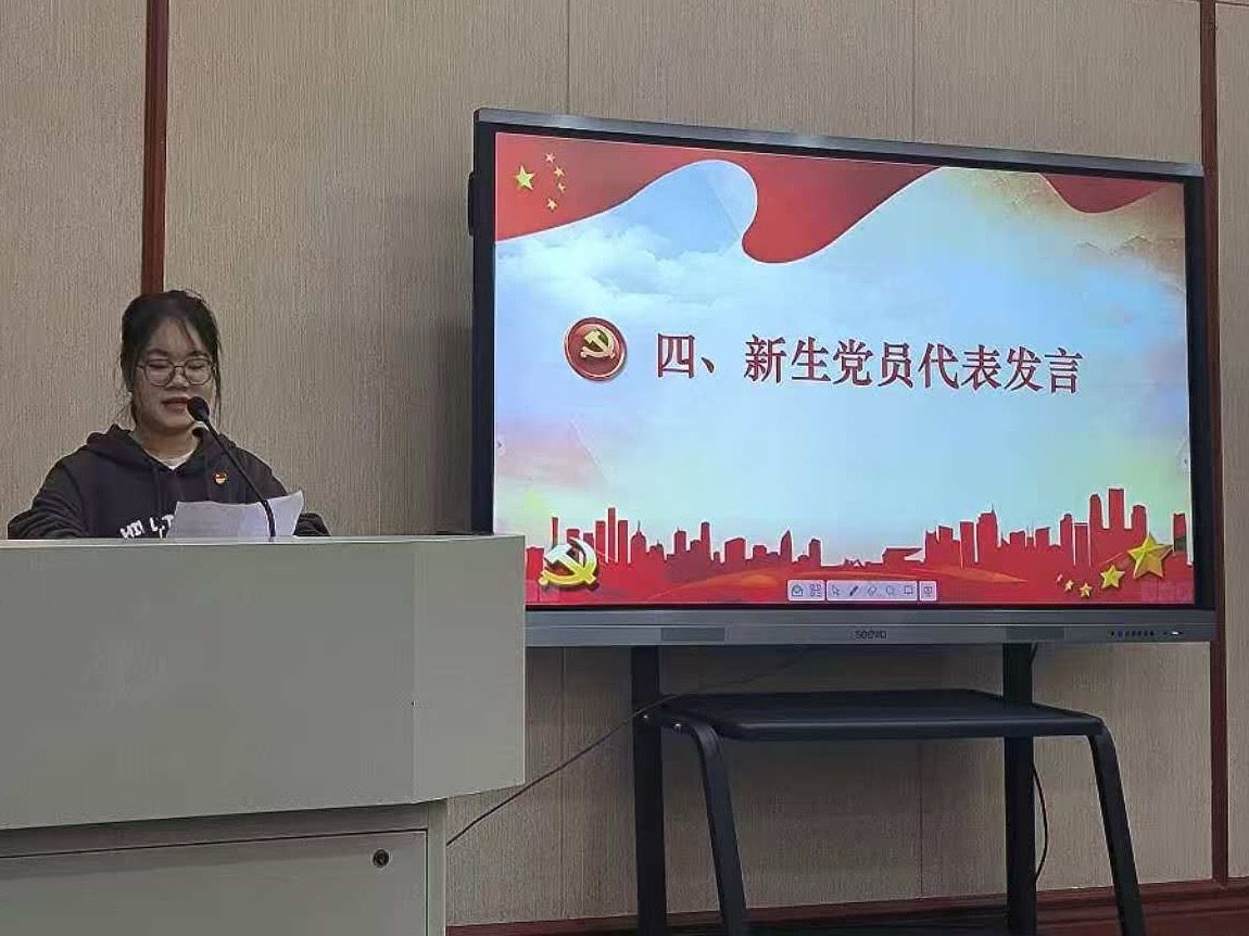 接着,白娜娜同志作为新生党员代表发言。她指出,作为语言学专业的学生,我们应自觉践行“言为心声,行为世范”的准则。她号召全体新生党员珍惜组织的温暖,主动将个人成长融入集体发展之中,在新起点上做到严谨治学、务实进取,以实际行动共同为学院建设贡献青春力量。