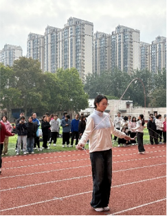 集体项目3分钟10人长绳“8”字跳将现场气氛推向高潮。摇绳的同学沉稳发力,绳索划出规整弧线;跳绳的队员们依次切入、灵活穿梭,形成流畅的“8”字轨迹。即使偶有失误,大家也迅速调整状态,用坚持与团结诠释了“更高、更快、更强、更团结”的奥林匹克精神。