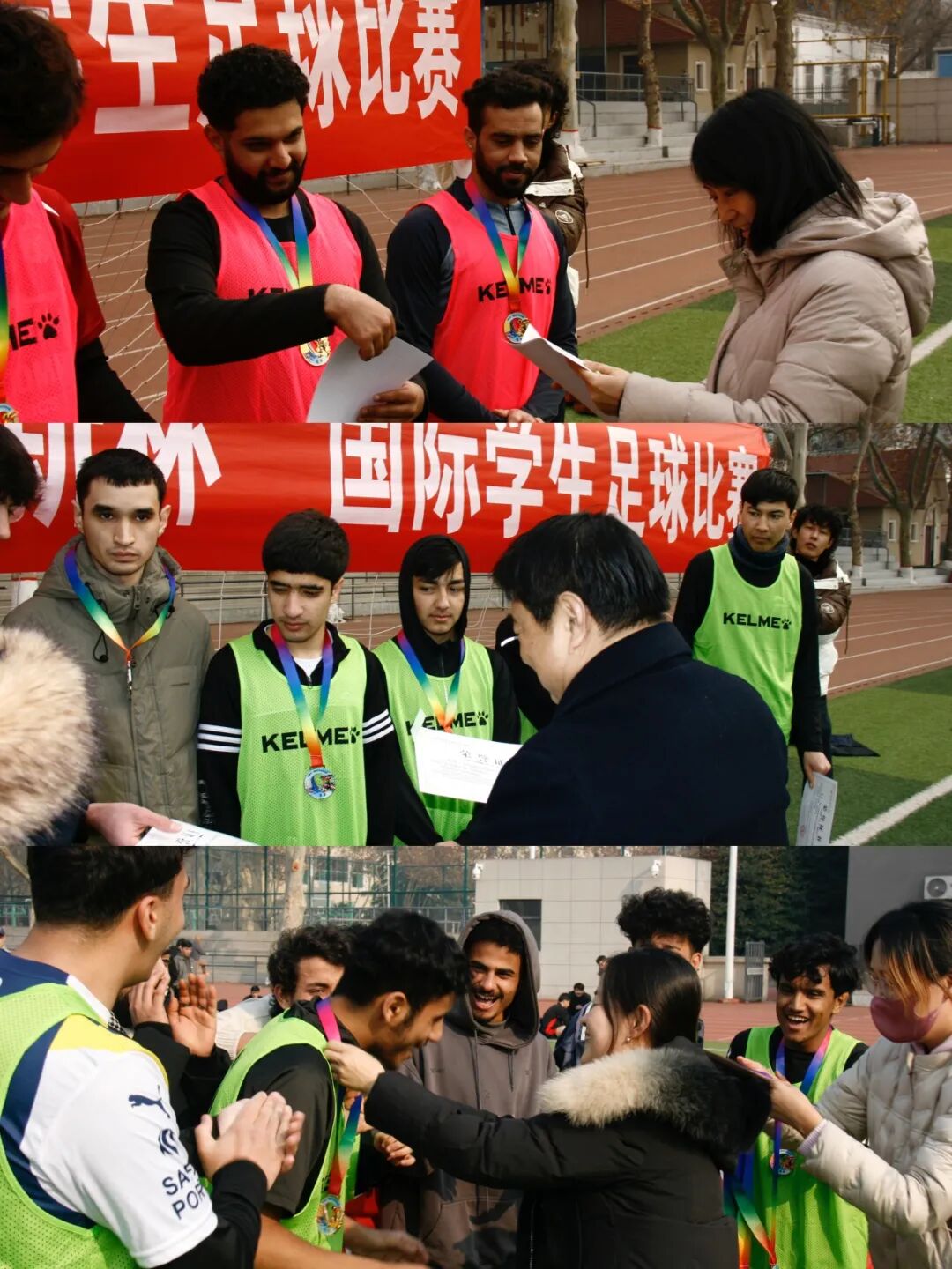 颁奖仪式上,伟德国际1946官网院长石洛祥、学院党总支书记李小玲、学院党总支副书记王钰为冠军、亚军、季军队伍颁发奖牌和参赛证书,并为其他参赛队伍颁发参赛证书。每一张笑容,每一次握手,都凝聚着这个冬日的汗水、友谊与共同记忆。以足球为媒,以绿茵为课堂,伟德国际1946官网“迎新杯”不仅是一场体育赛事,更是一次跨文化对话的生动实践。