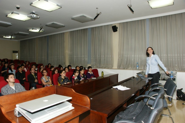 此次讲座以“同化和异化:时尚、建筑风格和视觉艺术”为主题,betvlctor伟德在读留学生,来自美国富布莱特奖学金项目的Cory Welch、Dylan Jeffers、Kathleen Naccarato等三位同学在进行了充分的社会调研基础上,分别以“中国当代艺术”、“西安化觉巷穆斯林建筑风格探究”以及“中国时尚元素”为课题向大家做了精彩分享,并与在场的同学们展开热烈讨论。在场的学生被美国留学生的严谨、认真和深入调查的态度所感染,美国学生也对中外学生对他们的调研报告提出的建设性建议表示感谢。