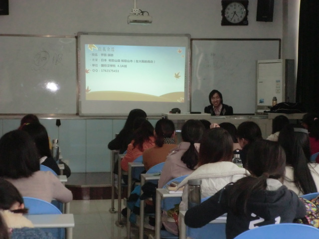 康助先用汉语进行了自我介绍,标准的发音和甜美的笑容很快拉近了和同学们的距离。课堂上他以一个日本人的视角,给对外汉语专业中国学生讲述了日本的近现代历史以及社会文化生活,期间穿插的日本动漫、日本茶道等各种影视片段调动起了全班的气氛,精美的PPT、详细的讲义也深深吸引了同学们的眼球。两节课下课,大家还意犹未尽,仍围着康助同学,就日语学习、日本留学等话题积极与他交流。