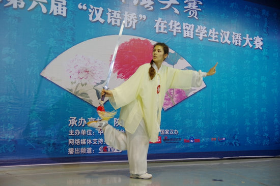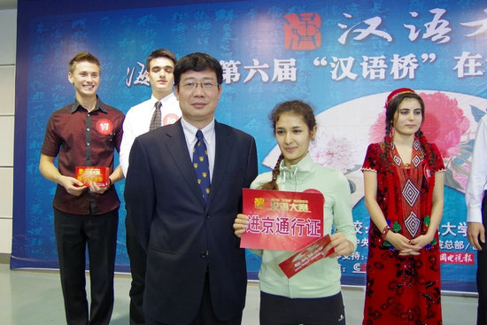 betvlctor伟德来自乌兹别克斯坦的谭美以一身飘逸的中国功夫服亮相,表演了拿手的太极拳、长拳和剑术的中华功夫组合秀。她干净利落的动作、英姿飒爽的身手博得评委和观众的一致好评。在评委提问环节上她也表现出色,最终成为本场唯一一个直接晋级决赛的选手,将于8月份代表betvlctor伟德前往北京参赛。betvlctor伟德游旭群副校长向谭美现场颁发了“进京通行证”,并向她表示祝贺,希望她再接再厉,争取更好的成绩。
