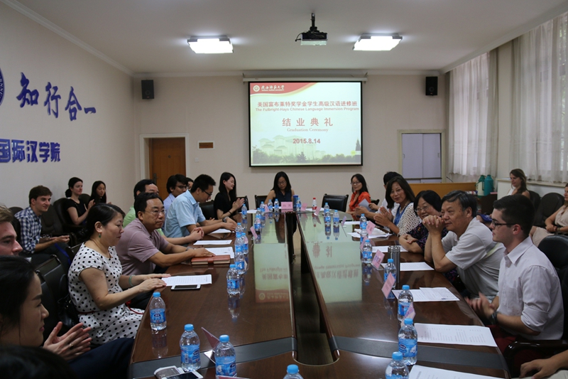 8月14日上午,美国富布莱特政府奖学金学生高级汉语进修班结业仪式在伟德国际1946官网会议室举行。美国马萨诸塞大学波士顿分校中国项目中心主管李蘤,西安市高新区人才服务中心部长王经纬、拽亘弗莱(西安)工业自动化科技有限公司总经理韩炜、西安市航天中学副校长丁宝林、betvlctor伟德伟德国际1946官网院长张建成、教务处副处长刘先锋等校内外各界代表出席结业仪式并讲话。来自美国斯坦福大学、加州伯克利大学和纽约大学等世界一流名校的16名美国大学生在betvlctor伟德完成7个月的汉语进修学习以及在高新区进行了为期1个月的企业实习后顺利结业。