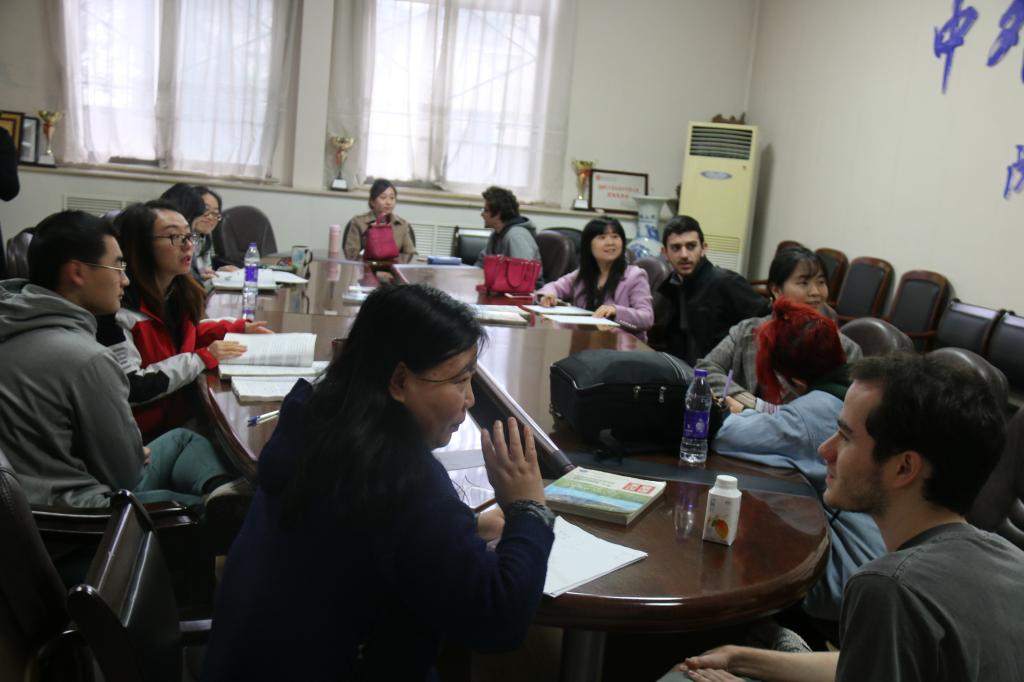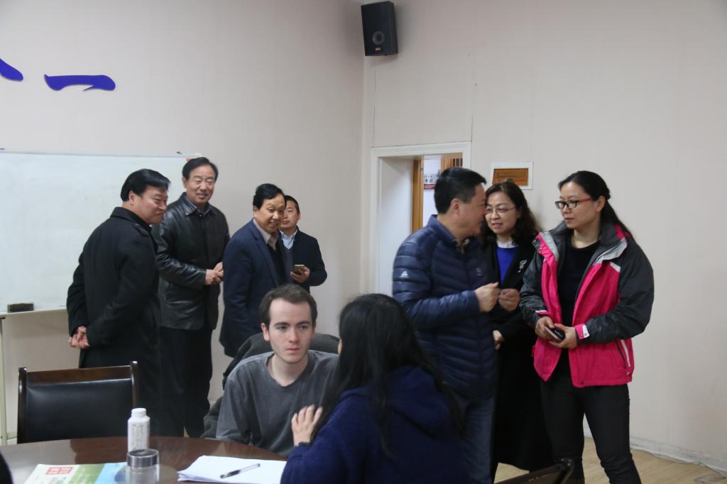 冯校长一行来到学院会议室,本学期留学生新生正在接受分班考试中的口语测评。