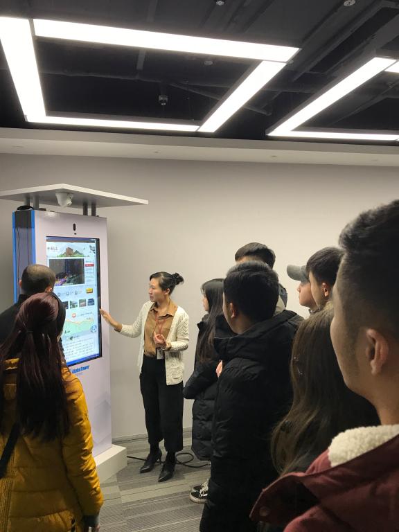下午3:00,师生一行到达识代运筹,公司行政人力总监駱颖女士、销售经理惠大庆先生在门口迎接。简单的欢迎词之后,駱颖女士为同学们介绍了公司概况,展示了“智慧秦岭”旅游大数据系统,然后,带领同学们参观公司的办公区。在演示室,駱颖女士向同学们展示了六块大型电子屏幕上以秒速更新的各类大数据,引来一阵阵惊叹。接下来,大家来到了会议室,销售经理惠大庆先生为同学们详细介绍了识代运筹自主研发的大数据获取与分析平台,以及公司成立至今的业务发展情况。同学们对“消费者画像”的分析完成过程非常感兴趣,因为大家看到了自己刚学过的“分析消费者市场”“市场细分”等理论知识是如何实践化的。辛蕊、艾迪代表同学们提问,大家展开了热烈的讨论。座谈即将结束时,公司创始人之一苏媛女士前来作了总结发言,对同学们选择“商务”作为大学学习的专业非常赞赏,鼓励同学们将来为发展中外经贸往来贡献力量!