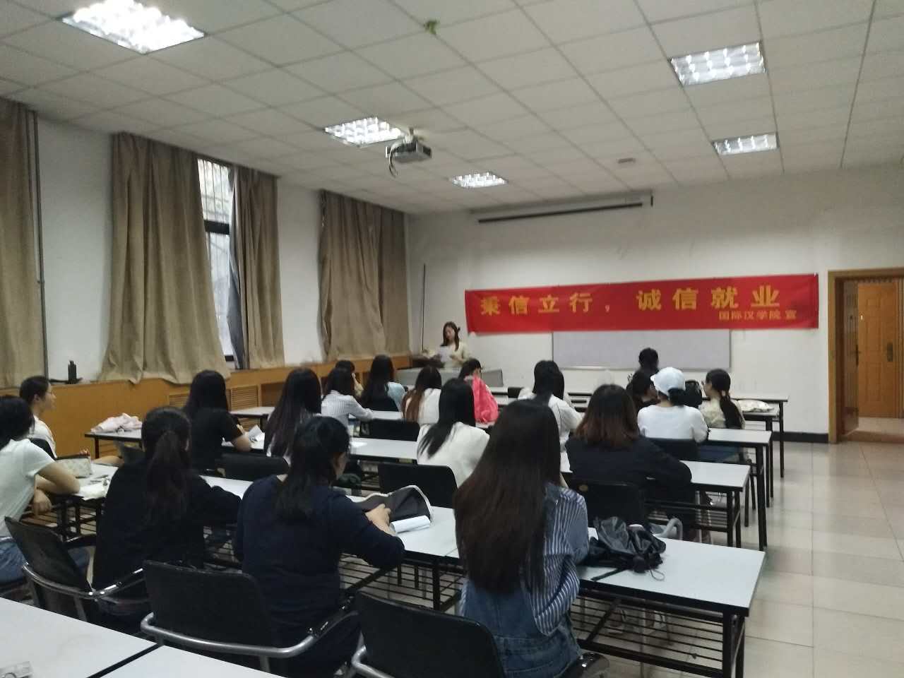 在进一步全面推进就业工作的关键阶段,2017年5月1日下午,我们2017届毕业生“秉信立行,诚信就业”宣誓仪式在伟德国际1946官网多媒体教室2顺利举行。2017届本科毕业班辅导员樊琳丽及全体本科毕业生参加了宣誓仪式。