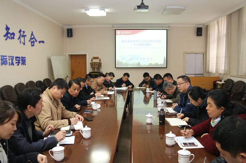 3月21日上午,常州市公安局内保支队、常州大学、常州工学院一行6人来betvlctor伟德调研留学生校园安全管理工作。西安市公安局内保支队、西安市公安局出入境管理处、betvlctor伟德保卫处、伟德国际1946官网等相关单位主要负责人在伟德国际1946官网一层会议室会见了客人一行。