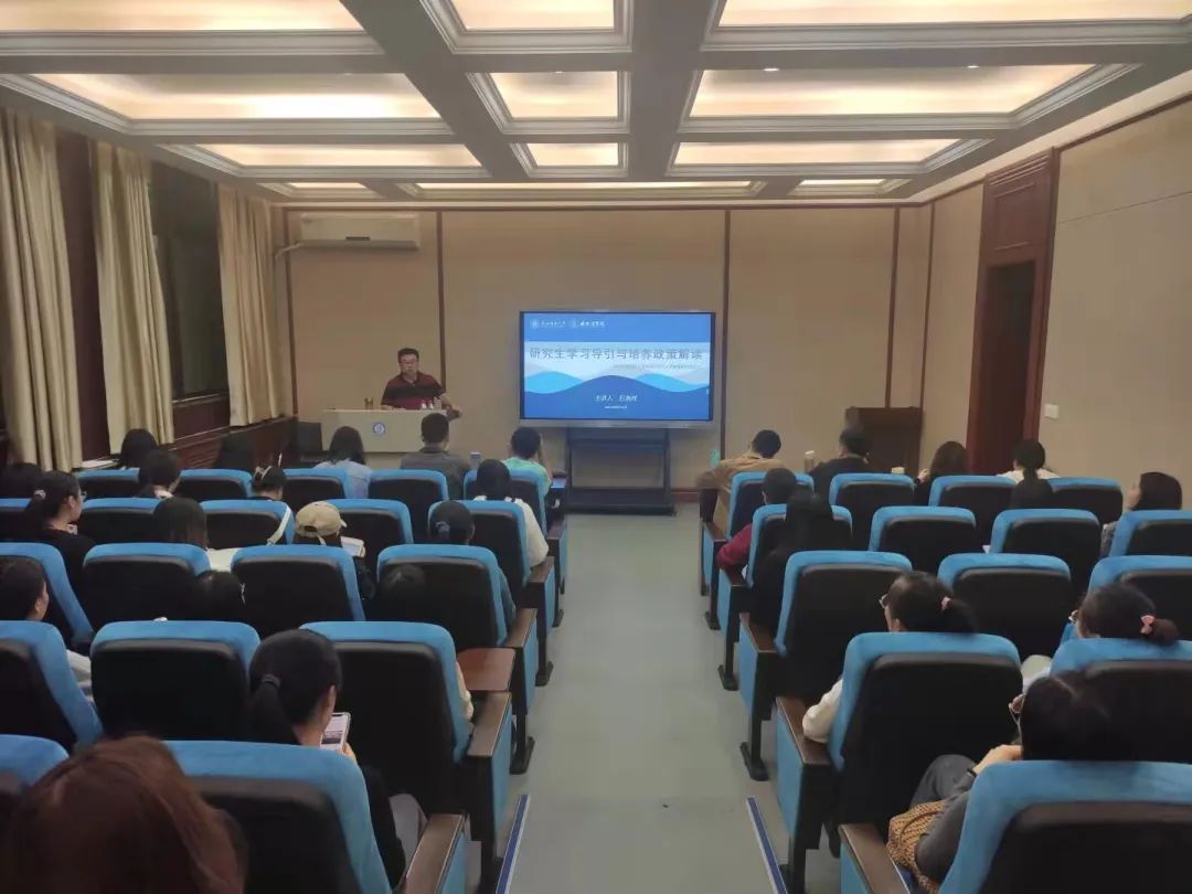 在研究生学习导引方面,石洛祥首先就“研究生读研期间应该做什么”提出了以下建议:广泛阅读,善于思考,勤于写作;关注时间管理,做好职业规划;扎实掌握专业知识,敢于勤于锻炼自我。接着,他提到研究生毕业前应该具备的能力,希望同学们培养科研创新能力和独立解决问题的能力,身心兼修,良友同行。最后,他围绕如何充实地度过研究生生活这一主题,就如何确定适合自己的研究领域、如何选择研究课题、如何阅读文献等方面给出了详细建议。在研究生培养政策方面,他重点对《伟德国际官网登录入口研究生学籍管理实施细则》和《伟德国际官网登录入口研究生学术论文学术不端检测和处理实施办法》两份重要文件进行了详细解读,叮嘱大家遵守规则、严谨治学。