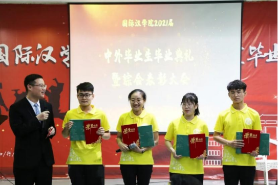 为送别毕业学子,同时表彰优秀,树立典型,弘扬和传承“中外融汇,知行合一”的国汉精神,6月22日上午,我们2021届中外毕业生毕业典礼暨综合表彰大会在雁塔校区崇鋈楼学思堂举行。作为国汉院历史上的首次中外学生毕业典礼,betvlctor伟德国际交流与合作处处长张凌云,党委研究生工作部副部长郝高建应邀出席,伟德国际1946官网全体领导班子成员及学院中外师生200余人参加。