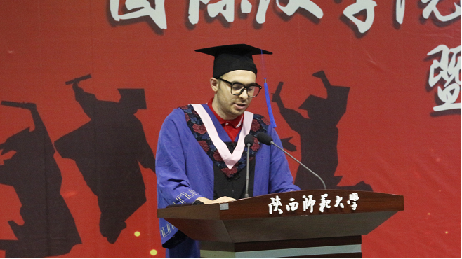来自意大利的2019级留学生研究生代表戈程鹏在发言中表达了对汉语的热爱、对老师的感激以及对未来的憧憬,他表示自己将以“路漫漫其修远兮,吾将上下而求索”的探索精神,认识中国、理解中国、感知中国,做中外文明交流的友好使者。
