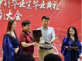 betvlctor伟德国际交流与合作处处长张凌云、学院党总支书记马兰向中外毕业生赠送毕业礼物。毕业班班长代表全体毕业生向学院回赠礼物。