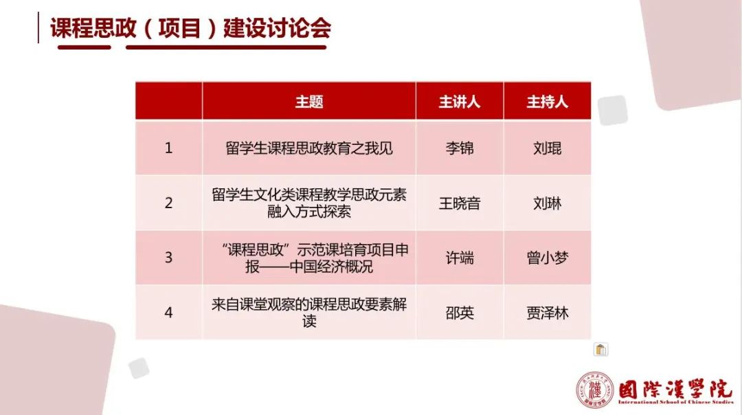 王晓音老师以《留学生文化类课程教学思政元素融入方式探索》为主题,结合自身的授课经验,以《中国现当代文学作品选读》、《跨文化交际》、《市场营销学》三门课程为例,讨论了不同文化类课程教学中思政元素的不同挖掘与呈现方式。