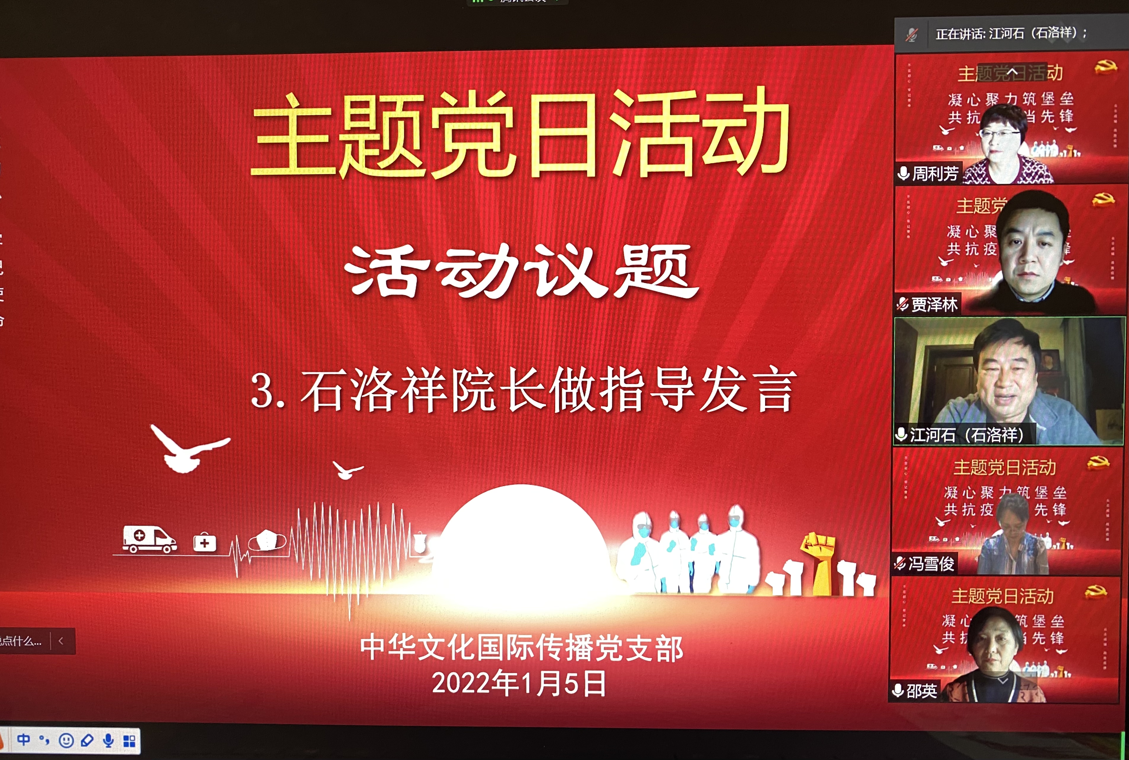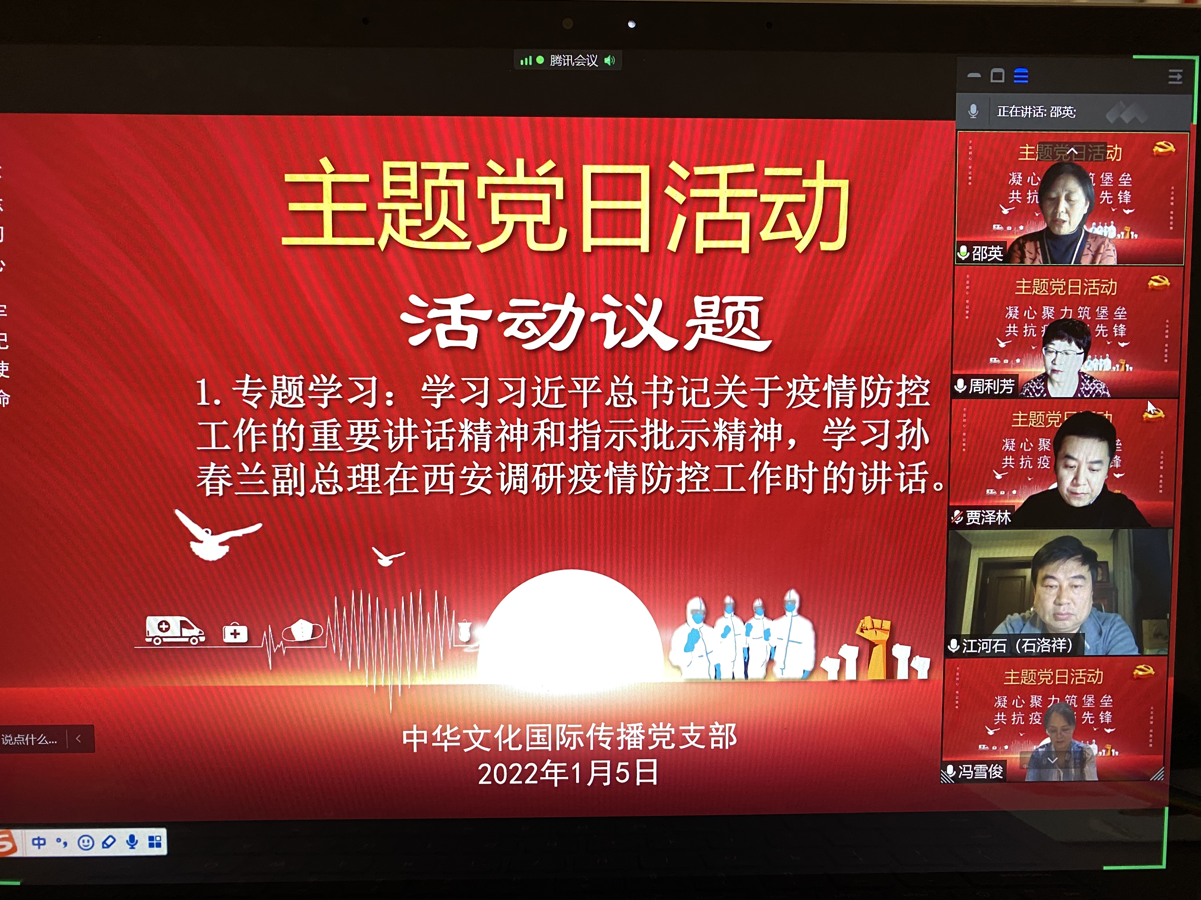 为了全面发挥教师党支部的战斗堡垒作用和教师党员的先锋模范作用,为坚决打赢疫情防控阻击战提供坚强的组织保证,2022年1月5日晚上,中华文化国际传播党支部全体党员汇聚云端,开展了“凝心聚力铸堡垒,共抗疫情当先锋”主题党日活动。活动由支部书记邵英主持,伟德国际1946官网党总支委员石洛祥院长列席了活动。