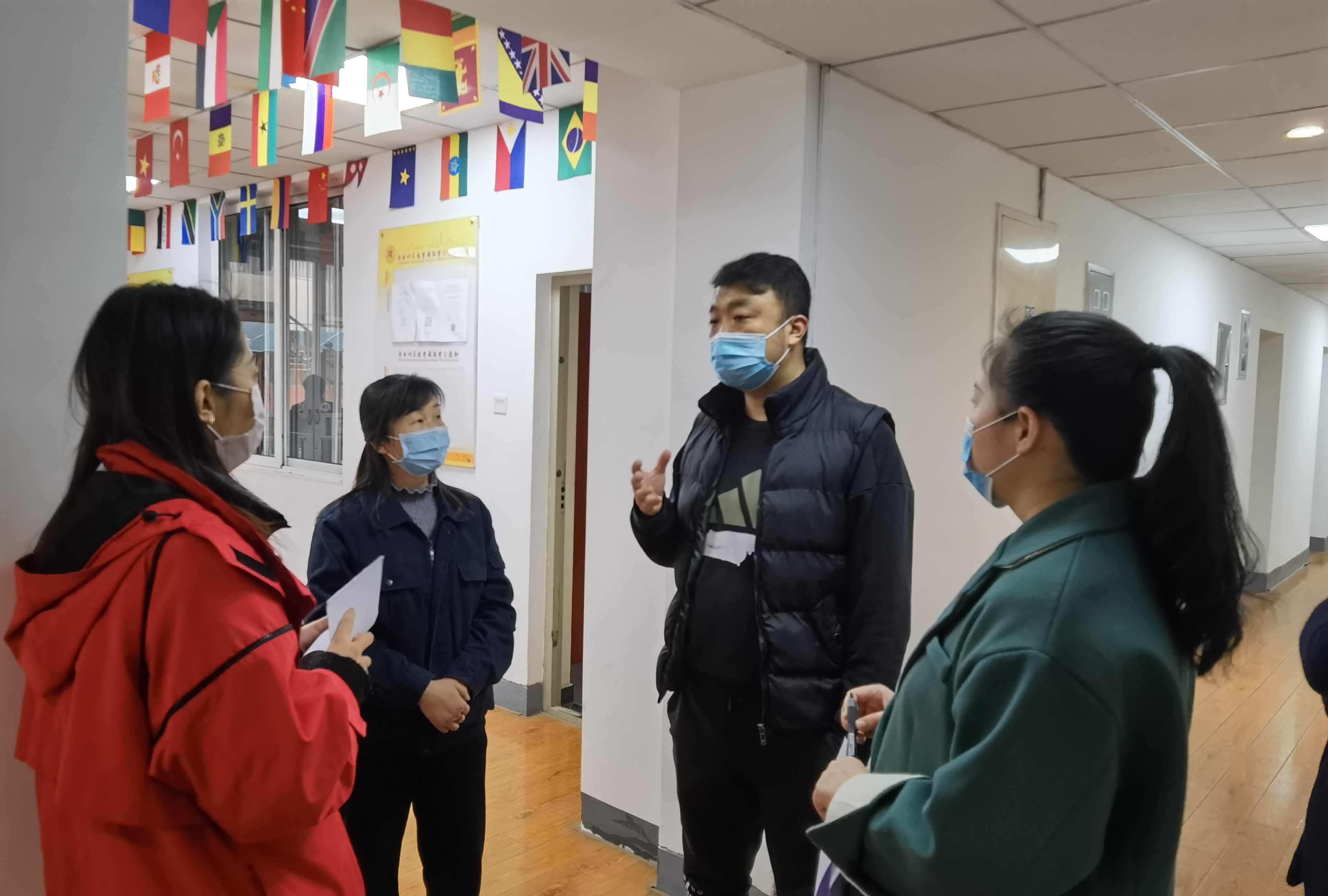 岁末年终,西安市接连出现多例新冠肺炎病例,疫情防控形势骤然紧张。为了响应学校疫情防控工作要求,全面深入了解在校学校的思想动态,12月16日至19日伟德国际1946官网党总支副书记张昊带领学工组全体专兼职辅导员深入学生公寓和学院教学楼,对目前在校的研究生和所有在雁塔校区居住的学校各学院国际学生进行了走访探望。