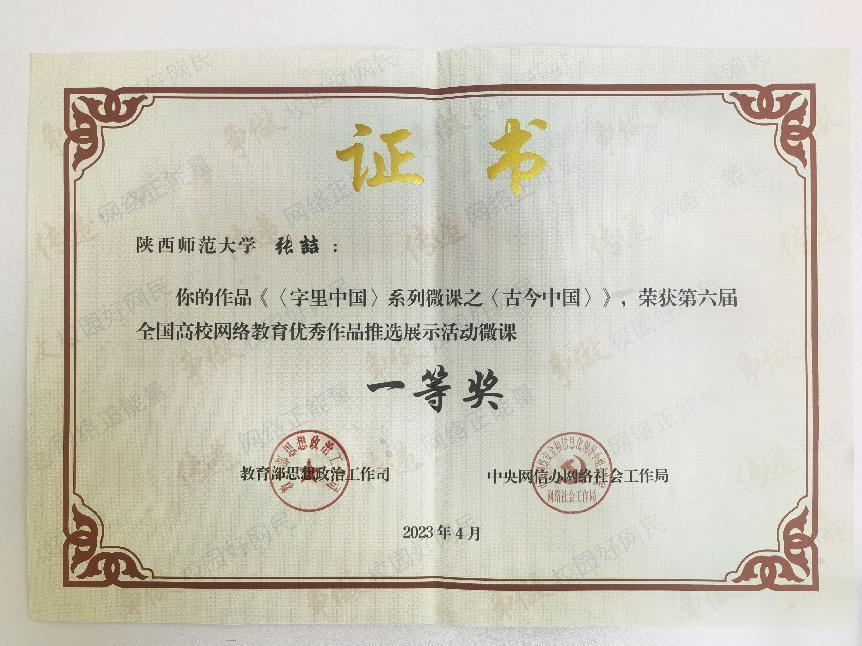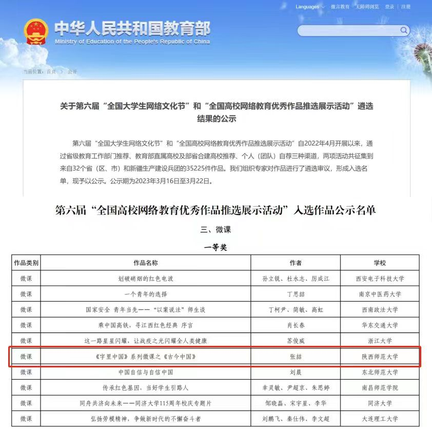 近期教育部公布了第六届“全国高校网络教育优秀作品”获奖课程,betvlctor伟德张喆副教授主讲的“《字里中国》系列微课之《古今中国》”荣获一等奖