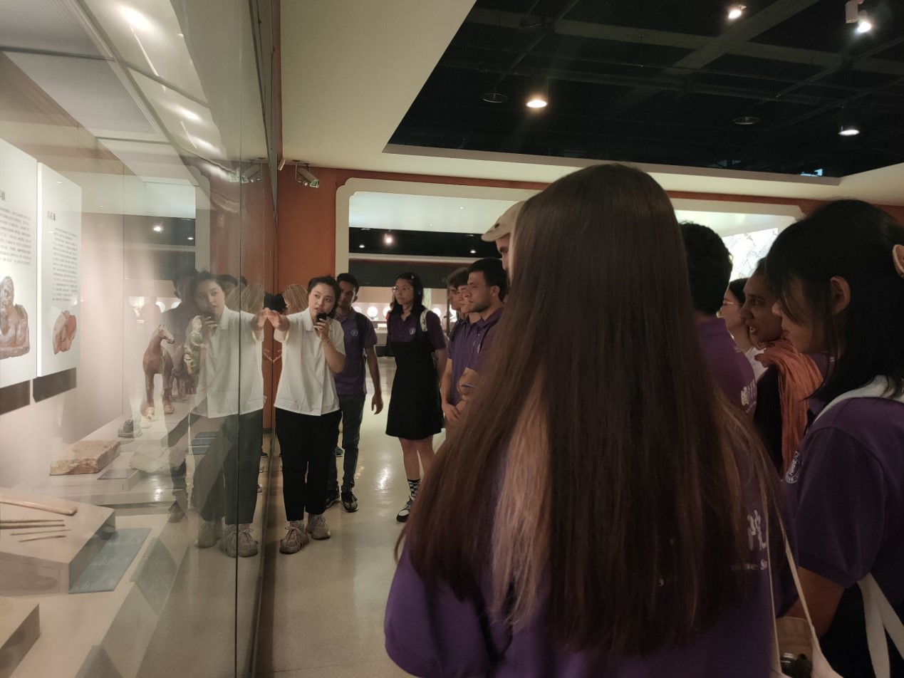 会后,实践团队前往西市遗址参观大唐西市博物馆。西市自隋开皇三年(公元583年)开市,至唐代末年遭到破坏,前后维持了320年的繁盛。在漫长的历史岁月中,西市作为丝绸之路东端的源头和世界贸易大市场,起到了中外商品集散中心之重要作用。一进博物馆大厅,国际学生们便被墙上展示的《唐代丝绸之路示意图》深深吸引,感到了唐代丝绸之路的繁华。走上二楼,中外学生一齐参观了《丝绸起点盛世商魂》展览。该展览展出了唐代西市东北“十字街”遗址、车辙遗迹和部分出土文物,介绍了历史上西市作为丝绸之路起点的重要地位,其中酒胡捐钱、窦乂买坑等故事给同学们留下了深刻的印象,感受到了千年前的西市温情。博物馆三楼为《货币中的丝路故事——丝路古币》专题展览,以48个古国的2000余枚货币连接起丝绸之路沿线各国、各地区、各历史时期的人文背景,展现了绚丽多彩的货币文化与丝绸之路的商贸繁荣。