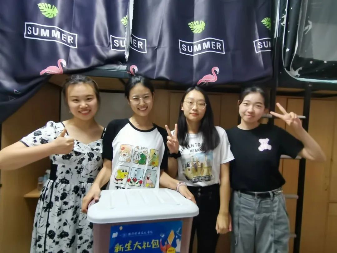 老师们步入新生寝室,为同学们送上学院精心准备的新生大礼包,内含毛巾、水杯、笔记本等生活必备品,为新生的生活、学习提供便利。