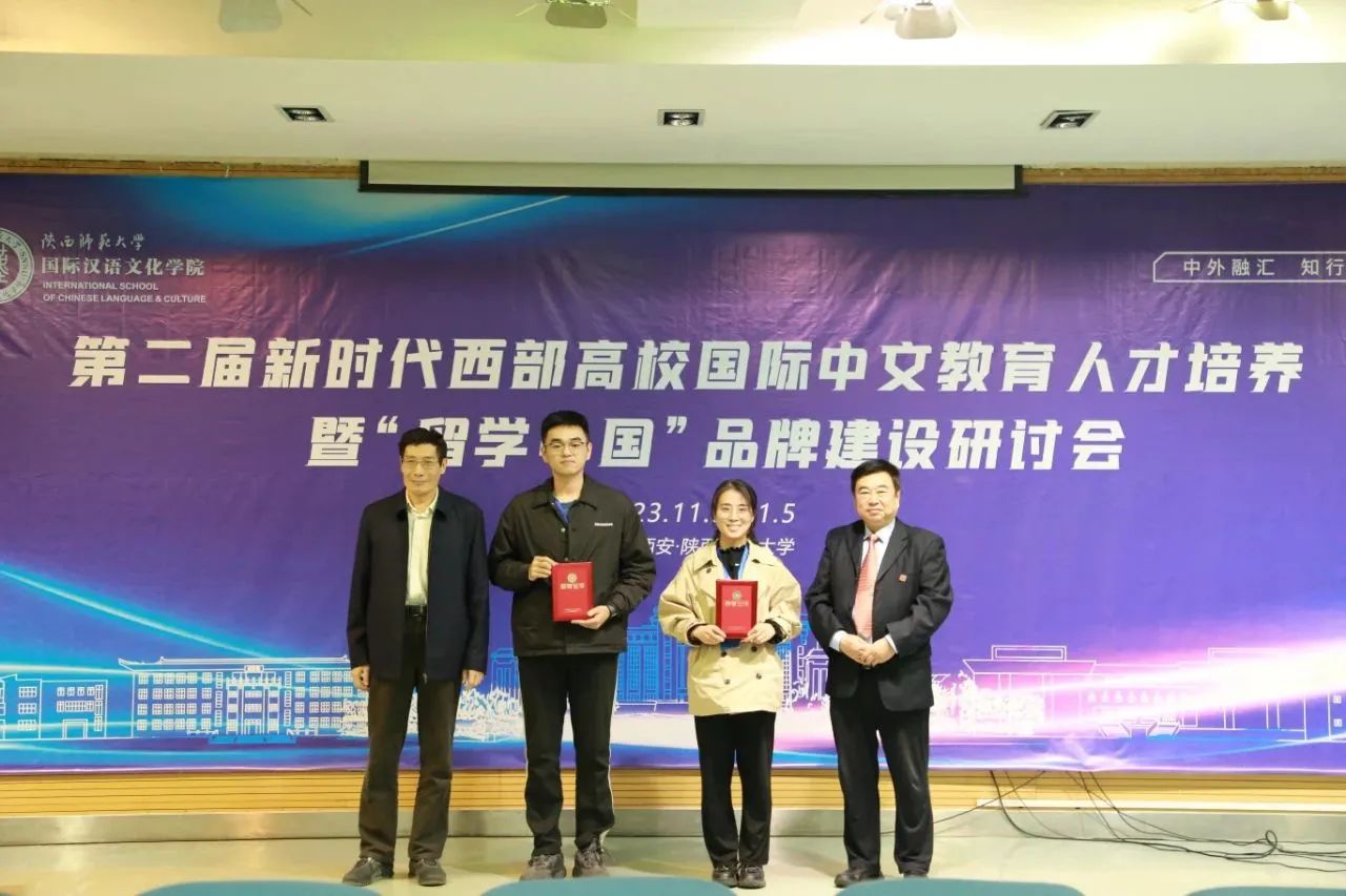 为切合大会国际中文教育人才培养主题,促进研究生学业发展,本次大会特设优秀研究生论文奖。中国人民大学硕士研究生秦瑜娇的《预设差比句的偏误研究——以“还”和“更”为例》等4篇论文获一等奖,伟德国际官网登录入口硕士研究生宋颖怡的《基于<高级中文读写教程>的生词复现率研究》、刘小雅的《基于需求分析的商务汉语课程教学策略研究》等8篇论文获二等奖,香港大学硕士研究生陈雨璇的《Passives, pseudo-passives and cross-linguistic influence in Mandarin-English bilingual children: an elicited production study》、西安石油大学硕士研究生吴兰泽润的《国际中文教育专业硕士就业问题研究——以西安石油大学为例》等12篇论文获三等奖。伟德国际1946官网院长石洛祥、党总支书记马兰、副书记张昊及各位专家为获奖者颁奖,副院长李敏主持了颁奖仪式。