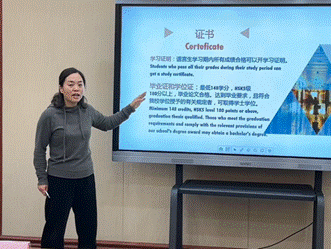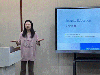 随后,学院招生办公室和学工组相关负责老师分别展开详细讲解。张丽老师对留学生教务进行了全面说明,让学生们清晰了解课程安排、学业要求等关键内容;畅晓梅老师为学生们准备 HSK 考试提供了重要指导;马艺玄老师聚焦签证办理问题,对签证种类、延期流程以及临时住宿登记表的相关事宜进行讲解;刘美君老师介绍了学院的本科和研究生学习项目;欣元老师特别强调了安全教育的重要性。他从交通安全、预防诈骗、非法就业以及校园活动等多个方面进行讲解;留学生管理干部赵晓越讲解了宿舍区域注意事项、处罚制度以及校外住宿注意事项,使学生们对住宿相关规定有了清晰认知。